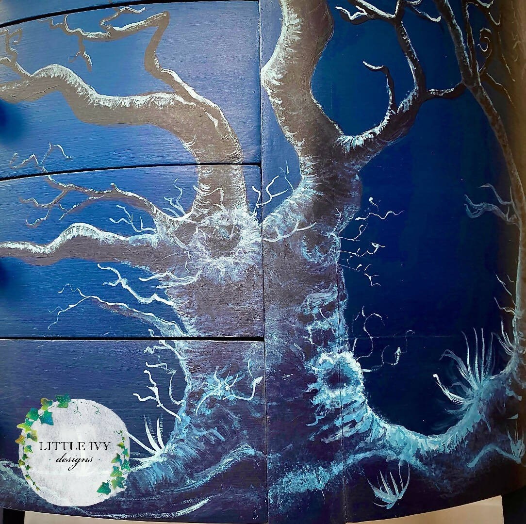Blends of chalk paint blues created the moonlit look, with the moon on top being painted in white and grey shades.